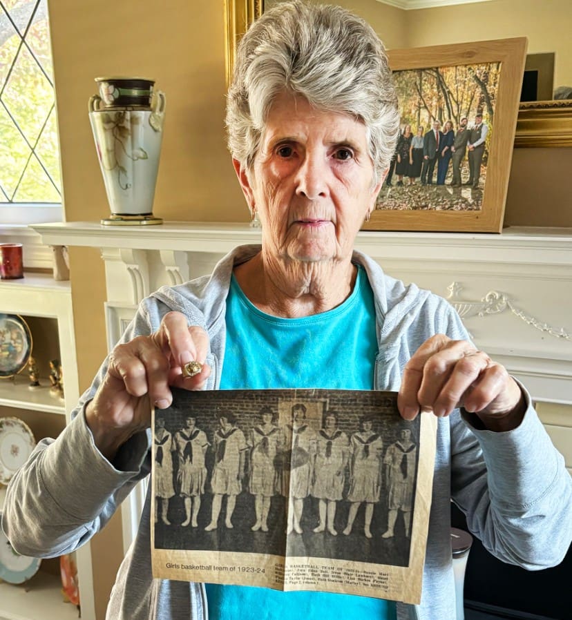 Eleanor Harden of Louisville, Kentucky, holds a newspaper clipping that features the 1923-24 Lindsey Wilson high school girls’ basketball team that included her aunt, the late Eliza Burks Payne. Payne, who graduated in 1925 from the Lindsey Wilson high school program, is third from right.