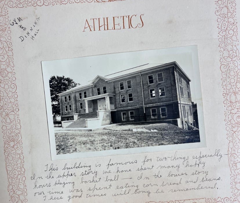 As Payne wrote on one of the pages of the donated scrapbook that includes a picture of what was then a new building on campus: “In the upper story we have spent many happy hours playing basket ball. In the lower story our time was spent eating corn bread and beans. These good times will long be remembered.”