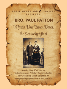 Adair County Genealogical Society Meeting: Martin Van Buren Bates, The “Kentucky Giant” Presented By Brother Paul Patton Monday, May 4th