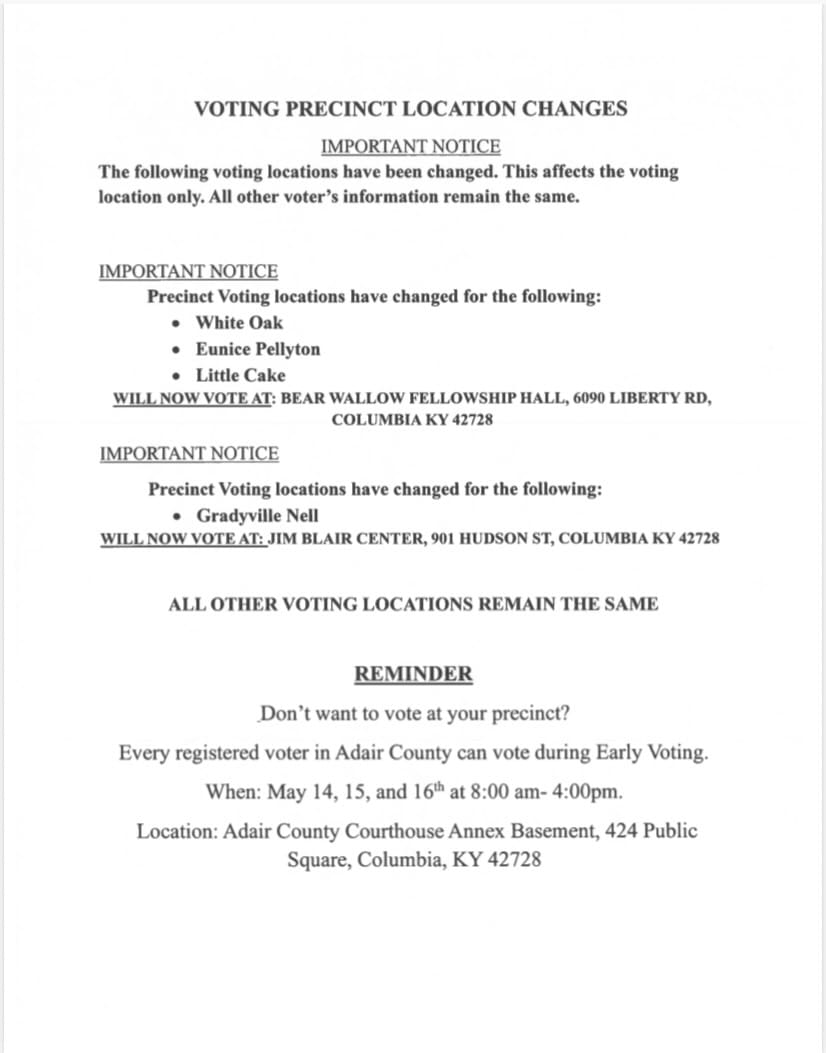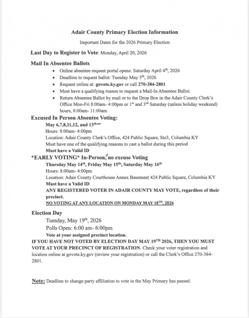 Adair County Primary Election 2026 Information: Important Dates, Notices And Voting Precinct Location Changes