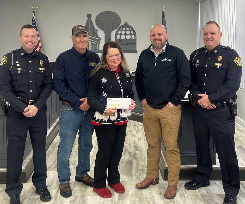 Pictured left to right: Chief Evan Burton with the Columbia Police Department, Gas Superintendent Jerry Watson, Mayor Hoots, Aaron Parrish with the Kentucky League of Cities, and Assistant Chief Drew Conn with the Columbia Police Department.