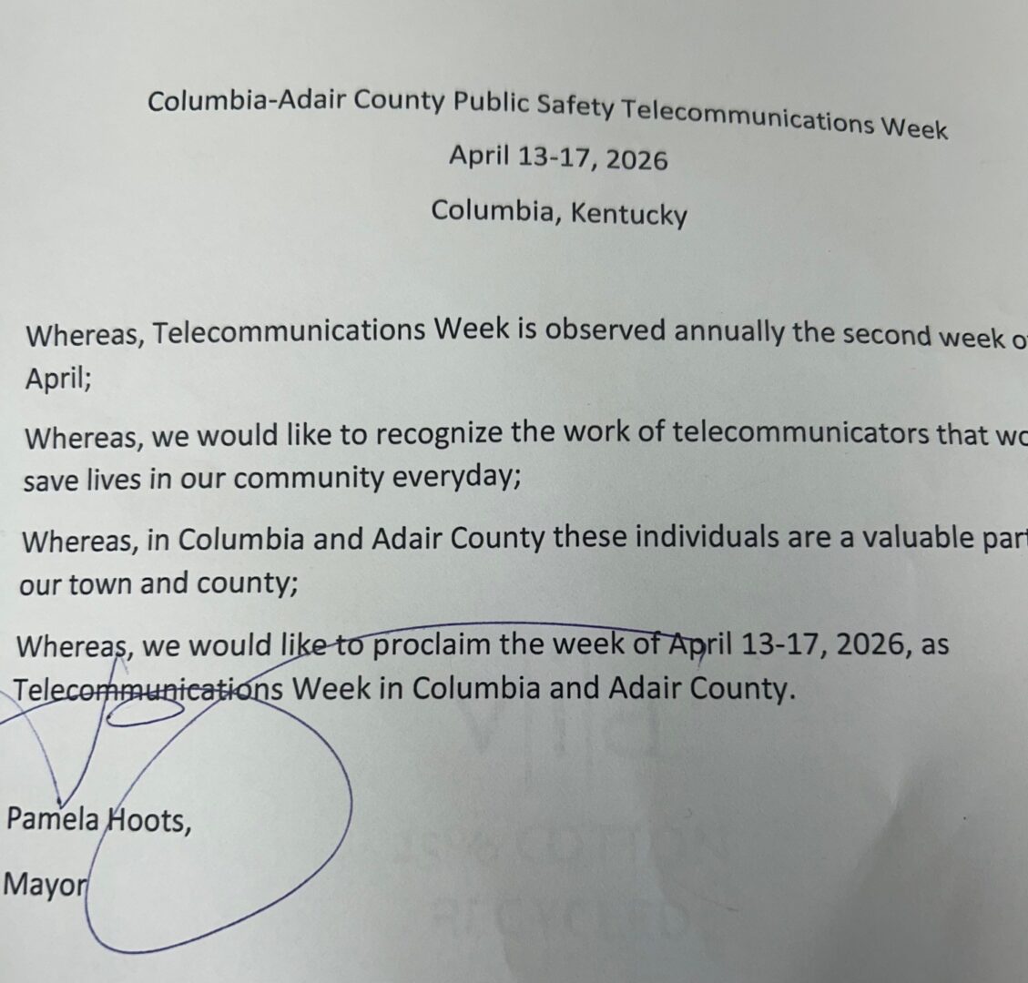 The week of April 13-17, 2026, has been proclaimed as Columbia-Adair County Public Safety Telecommunications Week, as the result of a proclamation issued by Columbia Mayor Pamela Hoots.