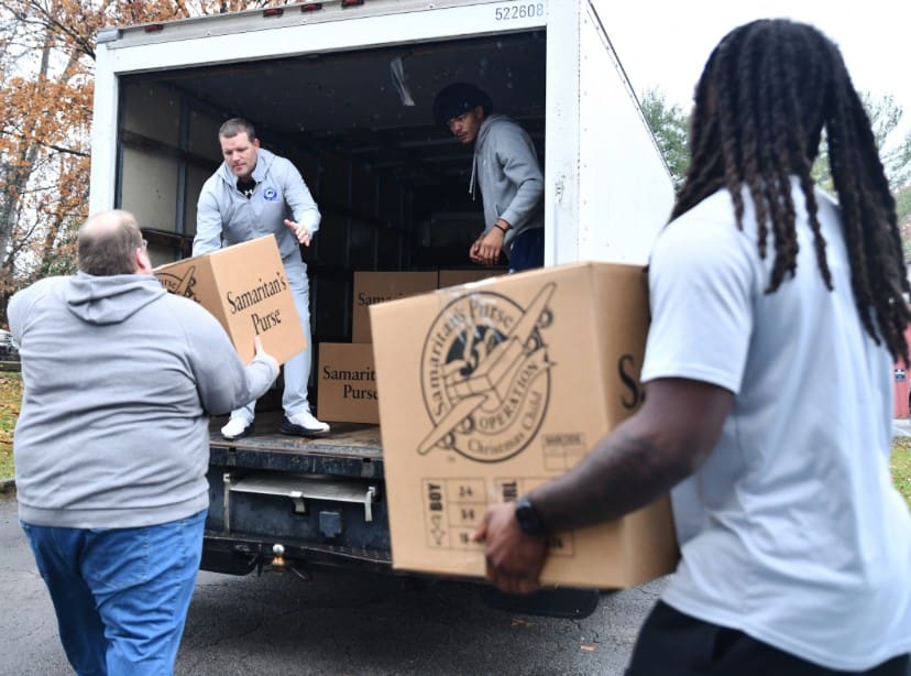 Linebacker Lou Burchfield, a graduate student from Maryville, Tennessee, said participating in Operation Christmas Child helps build camaraderie among teammates while supporting one of the football program’s larger goals.