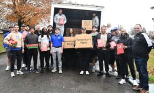 Members of the Lindsey Wilson University Athletics Department stand next to a truck filled with Operation Christmas Child shoeboxes on Friday, Nov. 21. Pictured, alphabetically: assistant football coach Sam Ambrose; assistant football Peyton Boji; football offensive coordinator Jay Bright; football player Lou Burchfield of Maryville, Tennessee; football defensive coordinator Daniel Cotter; assistant football coach Spencer Crisp; assistant football coach Marcus Graham; assistant football coach Calin Gurau; assistant football coach DJ Holden; football player Simon Keating of Newport, KY; football coach Phil Kleckler; assistant flag football coach Garrett Koestel; bowling coach John Meece; football player Seth Phillips of Clarksville, TN; Athletic Director Willis Pooler; football player Cameron Rankins of Hartsville, TN; men’s; basketball coach Chris Starks; football player Sam Taylor of Raleigh, NC; assistant football coach Lance Walker; and Associate Athletics Director Chris Wells.