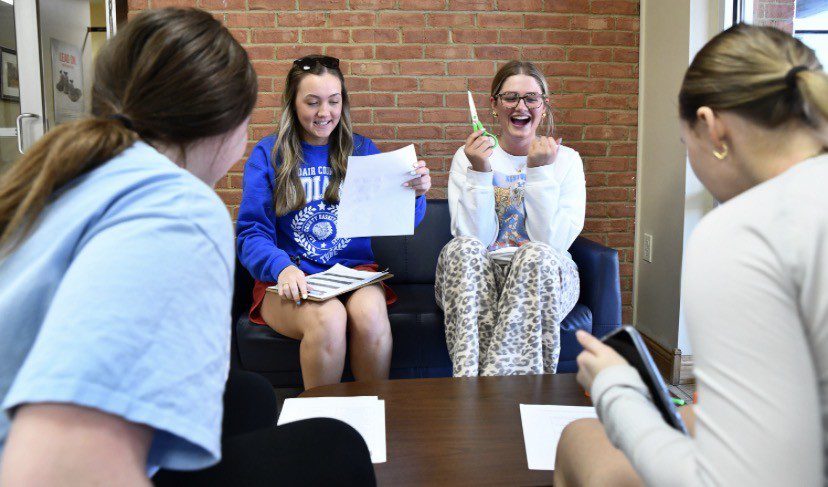 Lindsey Wilson University education major Amelia Brown ’29 of Columbia, right, celebrates completing an “Amazing Race” station on Thursday, March 19, in the Norma and Glen Hodge Center for Discipleship. At left is education major Jadelyn Waggener ’29 of Columbia. The students were part of a five-team competition in professor Jennifer Antoniotti-Neal’s “Children’s Literature” class that used the activity to review a unit on teaching poetry.