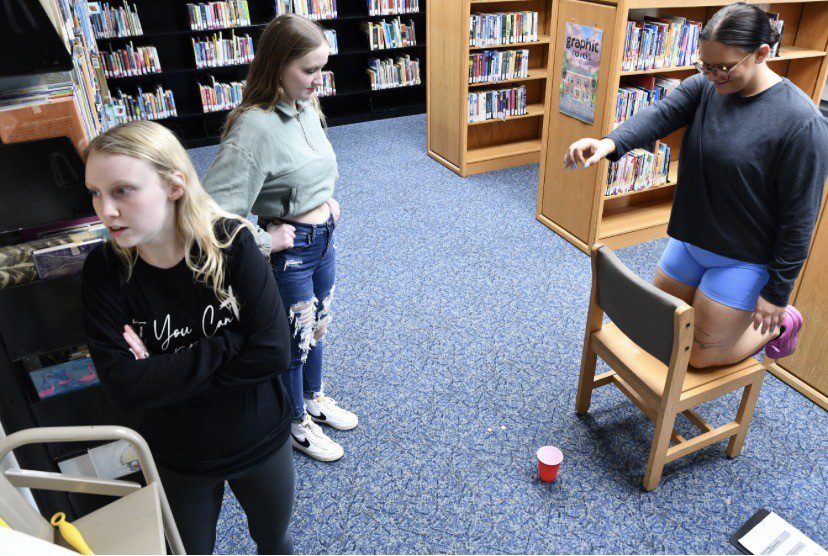 Lindsey Wilson University education major Aimee Flynn ’27 of Powell, Tennessee, attempts to drop a coin into a red plastic cup as Emberlyn Miller ’27 of Munfordville, Kentucky, center, looks on Thursday, March 19, in the juvenile literature and curriculum room of the Katie A. Murrell Library. At left, Olivia Thomas ’28 of Russell Springs, Kentucky, checks out instructions on a nearby bulletin board. The education majors were part of a five-team competition in professor Jennifer Antoniotti-Neal’s “Children’s Literature” class that used the activity to review a unit on teaching poetry.