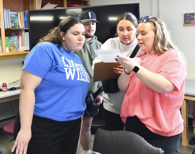 Lindsey Wilson University education majors, from left, Kalli McKinney ’27 of Campbellsville, Kentucky; Zach Brown ’27 of Albany, Kentucky; Emery-Kate Robertson ’27 of Russell Springs, Kentucky; and Megan Smith ’27 of Elizabethtown, Kentucky, consult with one another on an instruction on Thursday, March 19, in the university’s Goodhue Academic Center. The students were part of a five-team competition in professor Jennifer Antoniotti-Neal’s “Children’s Literature” class that used the activity to review a unit on teaching poetry.