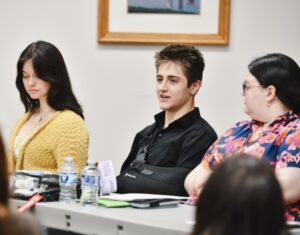 Lindsey Wilson University student Kyrnan Bowman ’29 — a business administration major from Columbia, Kentucky — responds to a question about his research project, “The Economics of Jiu Jitsu,” at the 2026 spring symposium of the R.V. Bennett Honors Program, held Tuesday, April 14, in the Thomas D. Clark Reading Room of the Holloway Building. Looking on is Briana Frey ’29, a psychophysiology major from Breeding, Kentucky and Meghan Roberts ’26, a biology and psychophysiology major from Manchester, Kentucky.