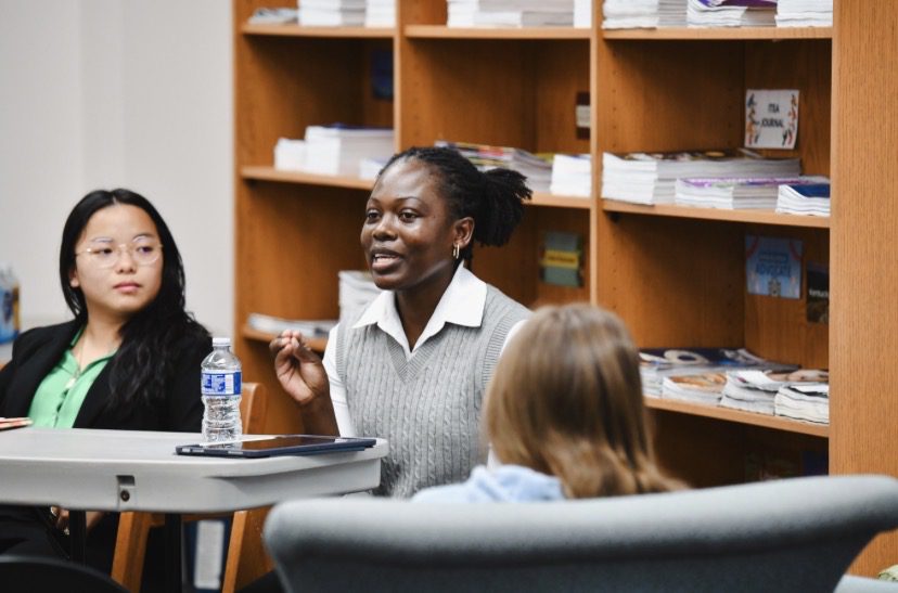 Lindsey Wilson University student Stella Kwagala ’27, a nursing major from Uganda, discusses her research project, “The Role of Nursing Education in Improving Injury Prevention for Children Under Five.” Kwagala presented her research at the 2026 spring symposium of the R.V. Bennett Honors Program, held Tuesday, April 14, in the Thomas D. Clark Reading Room of the Holloway Building. Looking on is Katie Saylor ’26, a psychology and human services and counseling double major from Louisville, Kentucky.