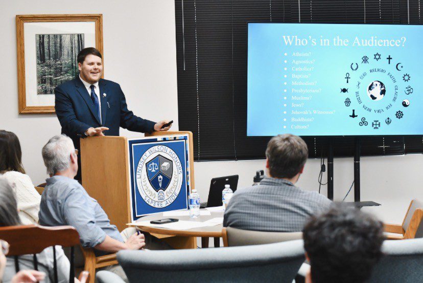 Lindsey Wilson University student Keegan Benton ’29, a psychophysiology major from Summerville, South Carolina, presents his research, “Faith or Fallacy: Exploring the Spectrum Between Cult and Religion,” at the 2026 spring symposium of the R.V. Bennett Honors Program, held Tuesday, April 14, in the Thomas D. Clark Reading Room of the Holloway Building.