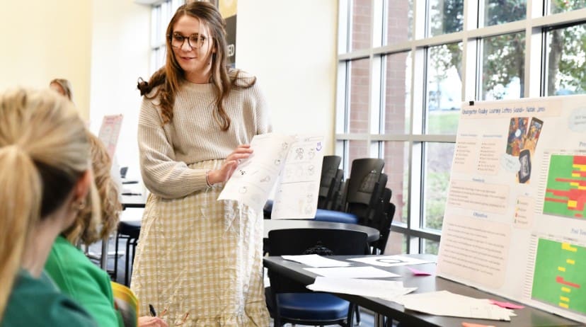 Lindsey Wilson University student Natalie Jones ’26 of Columbia discusses her research project, “Kindergarten Reading: Learning Letters, Learning Sounds.” Jones presented her research in the Roberta D. Cranmer Dining & Conference Center during Lindsey Wilson’s 2025 fall semester Academic Celebration Week.