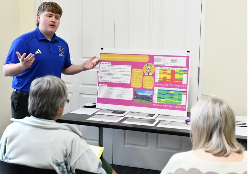 Lindsey Wilson University student Deric Shearer ’26 of Nancy, Kentucky, discusses his research project, “Argumentative Essay Writing” for seventh grade students. Shearer presented his research in the Roberta D. Cranmer Dining & Conference Center during Lindsey Wilson’s 2025 fall semester Academic Celebration Week.