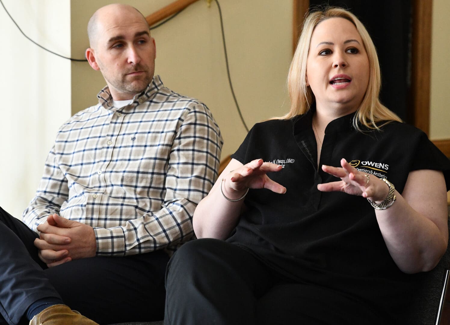 Dr. Andrea Owens ’09 discusses her work as a dentist during a Lindsey Wilson University “Career Week” panel in the university’s Norma and Glen Hodge Center for Discipleship as fellow dentist Dr. Tyler McCubbins ’09 listens.