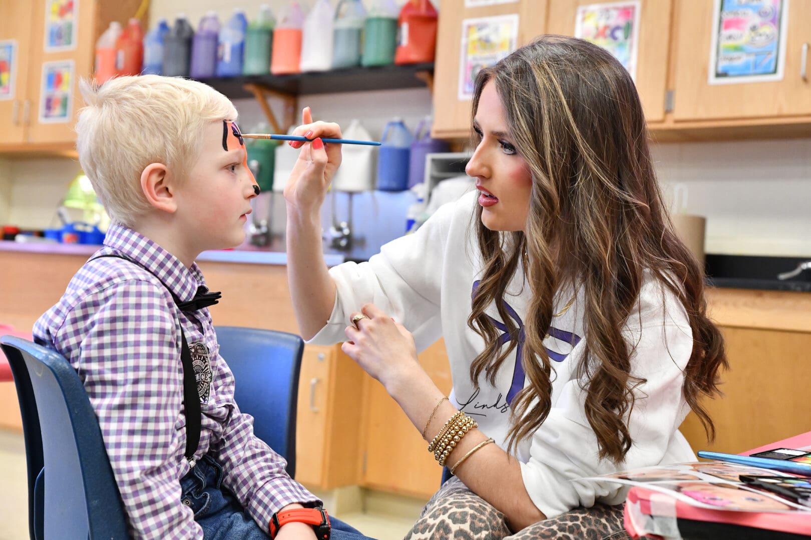 Lindsey Wilson University student Lakyn Stearns ’26 of Columbia paints a tiger design on the forehead of kindergartener Winston Mackenzie, 6, of Columbia, during Read Across Adair County on Thursday, Feb. 26, at Adair County Primary Center.