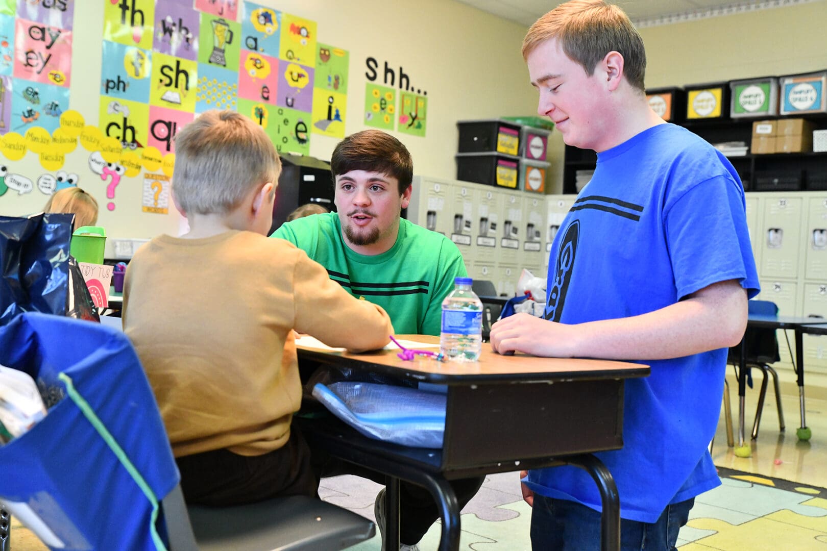 Lindsey Wilson University students Zack Brown ’26 of Albany, Kentucky, left, and Collin Pike ’26 of Columbia assumed two characters from the children’s book “The Day the Crayons Quit” during Read Across Adair County on Thursday, Feb. 26, at Adair County Primary Center.