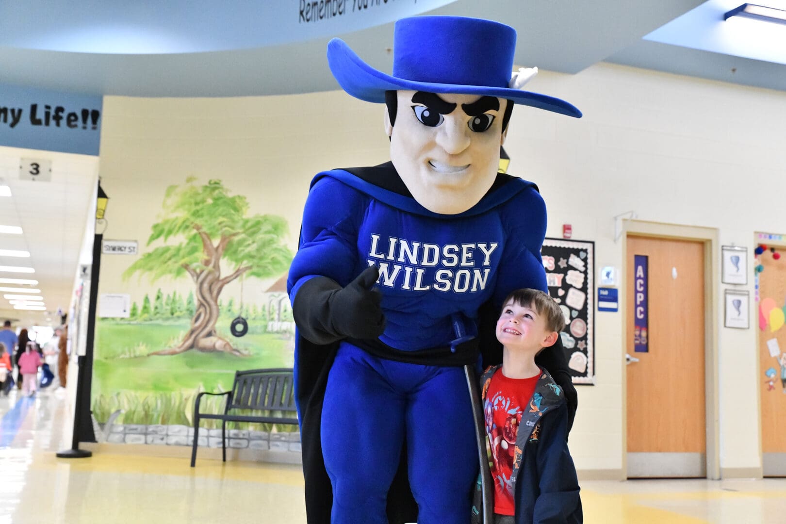 Lindsey Wilson University mascot Blue Raider Bob poses with pre-school student Deklynn Coe, 5, of Columbia during Read Across Adair County on Thursday, Feb. 26, at Adair County Primary Center. Deklynn attended the event with his mother, White Rodgers Coe, who is a 2014 Lindsey Wilson alumna.