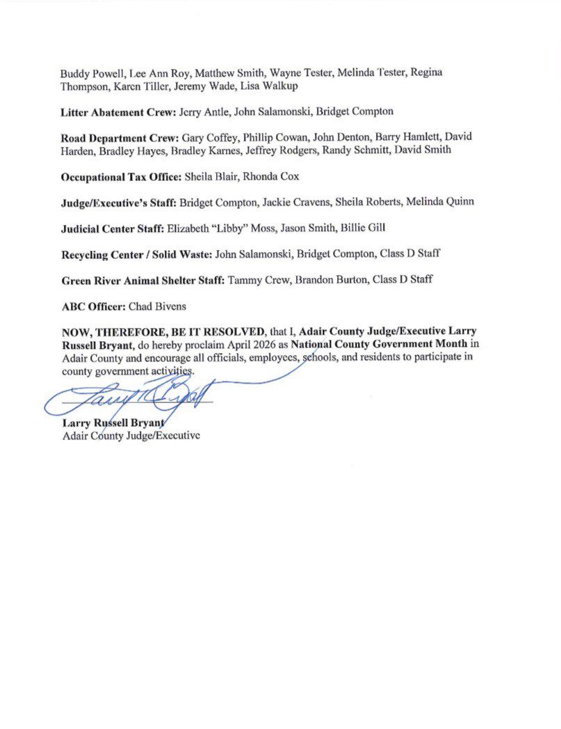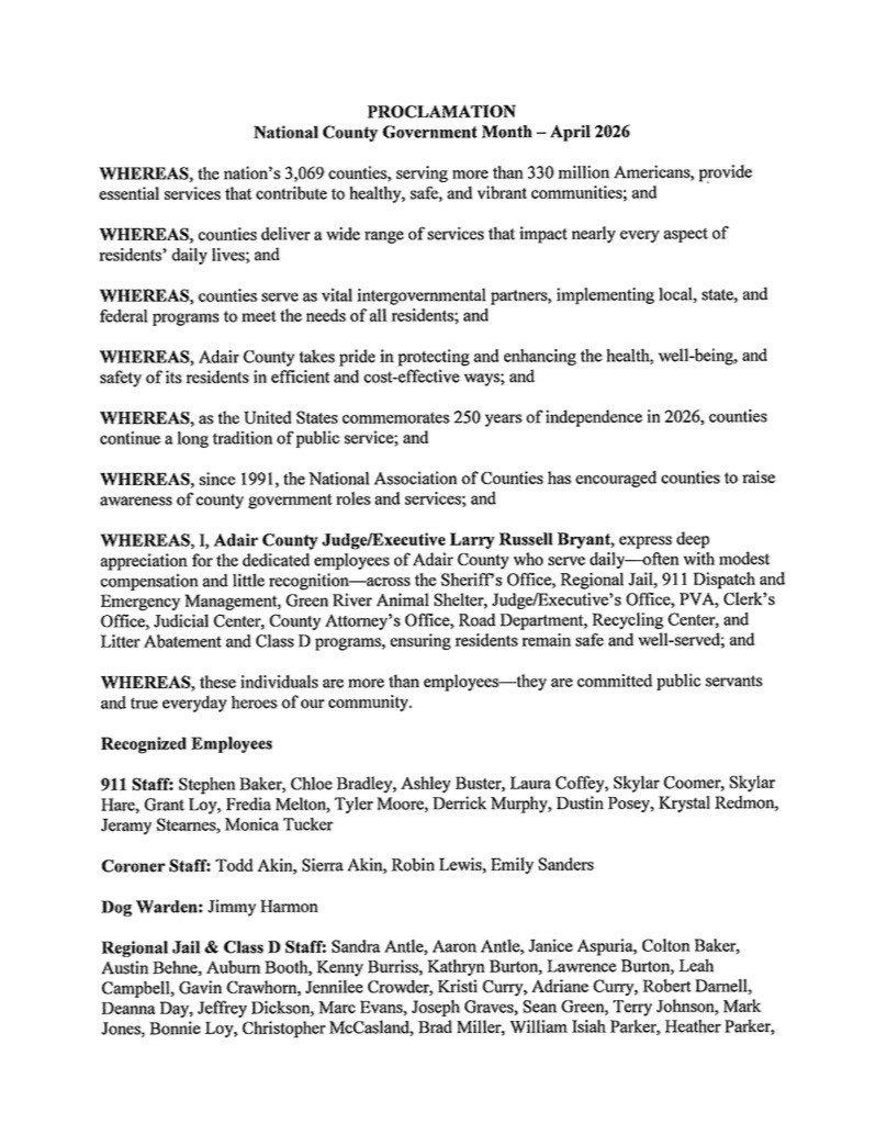 A proclamation on behalf of Judge Executive Larry Russell Bryant, recognizing the hard work and dedication of all county employees.