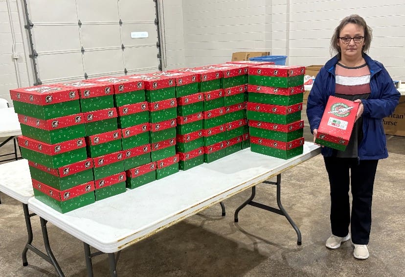 Angie Pierce shops year-round looking for items for her shoebox gifts. She came by Friday morning for her annual drop off during national collection week.