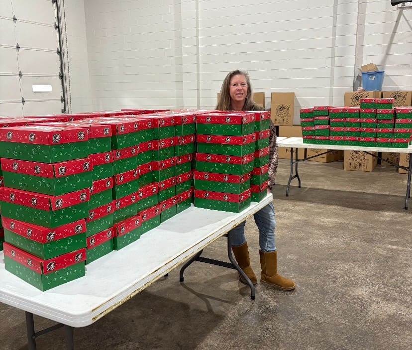 Packing the final two shoebox gifts of the 2025 national collection week campaign were Kerry and Terrie Radford. These boxes were turned in by the Columbia Baptist Church bringing their total to 1250 boxes and the Adair County total to 3667 shoebox gifts.