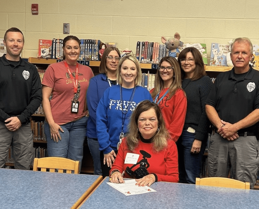 The proclamation was signed at Adair County Primary Center with Family Resource Representatives: Hali Anderson, Pam Bivens, Heather Dudley, and Kara Iqbal; along with Katie Jeffries with the Healthy Kids Clinic. Chief Evan Burton and SRO John Harris were also in attendance.