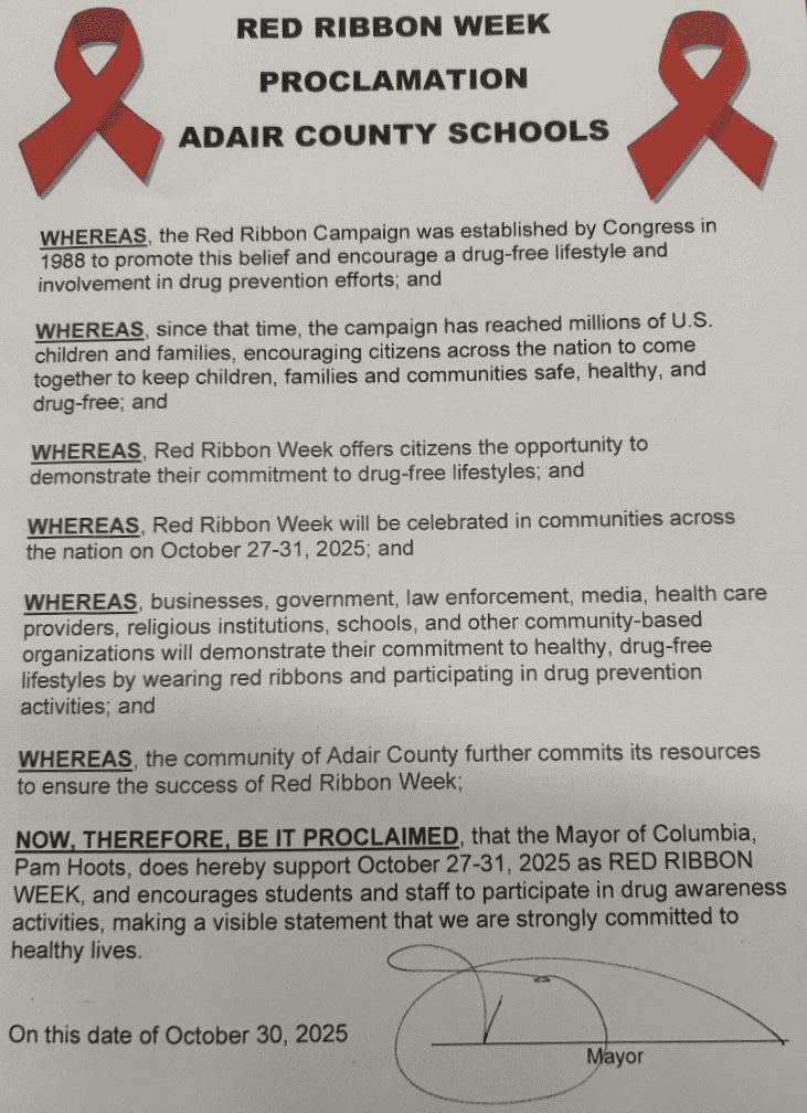 Red Ribbon Week has been proclaimed in the Adair County School System as the result of a proclamation issued by Mayor Pamela Hoots.