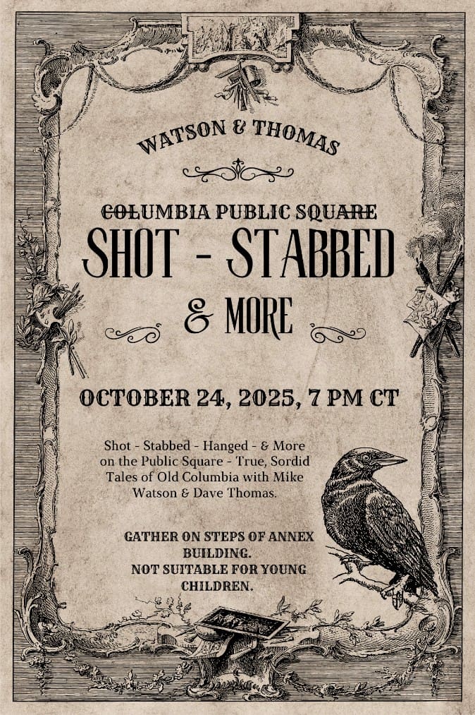A unique walking tour of the Public Square in Columbia will highlight a few of the many incidents that have occurred on—and off—the Town Square, illustrating its rich history. Just as the title states, there will be incidents of our varied past illustrated, some in graphic detail.