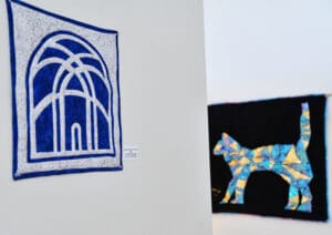 The fiber pieces “Lindsey Wilson University,” foreground, by Kimberly Harden ’22 and Candyce Counts ’22, and “Shiny Calico,” by Jaye Farthing ’23 and ’24, are featured in the Lindsey Wilson University art show “Then and Now,” which is on display through Dec. 13 in the university’s Lucretia C. Begley Art Gallery.
